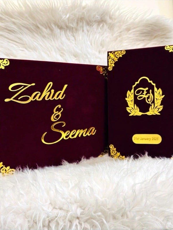 Make your special day unforgettable with the Maroon Nikah Booklet with Box & Pen, designed to add elegance and meaning to your Nikah ceremony. Featuring a rich maroon velvet finish with intricate golden accents, this beautifully crafted set is personalised with the couple’s names and special details. The premium box safely holds your Nikah booklet and pen, making it a treasured keepsake for years to come. With its regal colour and refined craftsmanship, this set enhances the beauty of your ceremony while preserving your cherished memories in a timeless and graceful way.