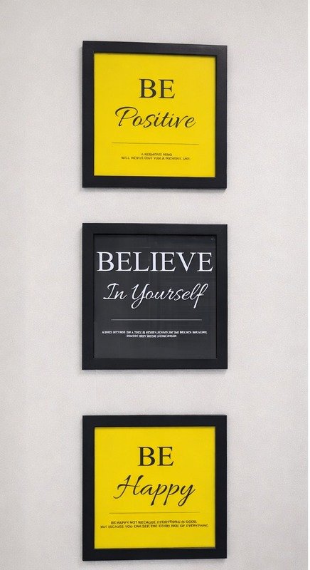 Brighten your space and inspire positivity with this stylish set of three motivational wall frames. Featuring bold quotes “Be Positive,” “Believe in Yourself,” and “Be Happy,” these frames are designed to uplift your mood and mindset every day. The vibrant yellow and classic black color combination adds a modern touch that suits homes, offices, study rooms, and workspaces. Crafted with sturdy frames and clear prints, they are easy to hang and durable for long-term use. Perfect as home décor or a thoughtful gift, this inspirational frame set encourages confidence, happiness, and a positive outlook.